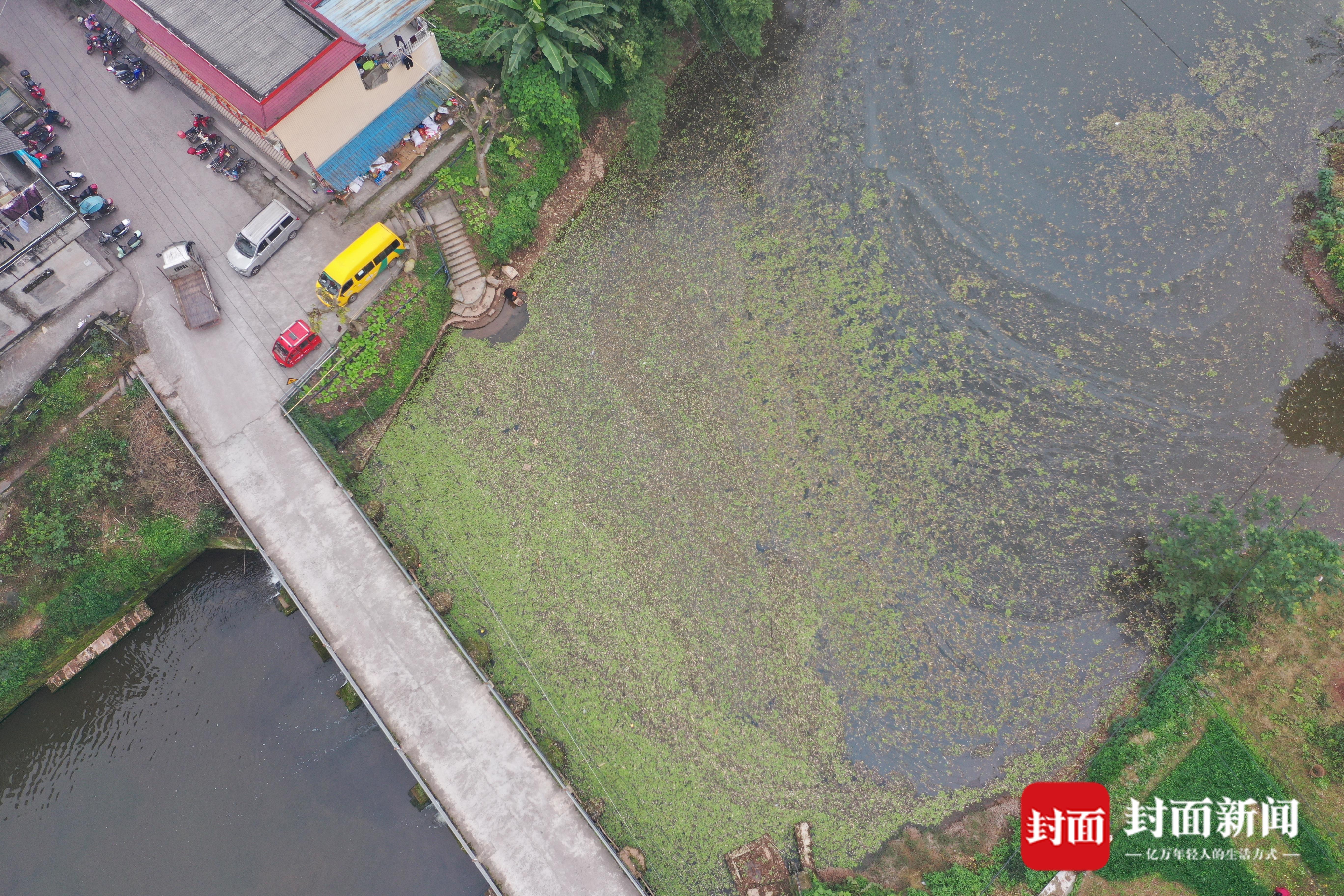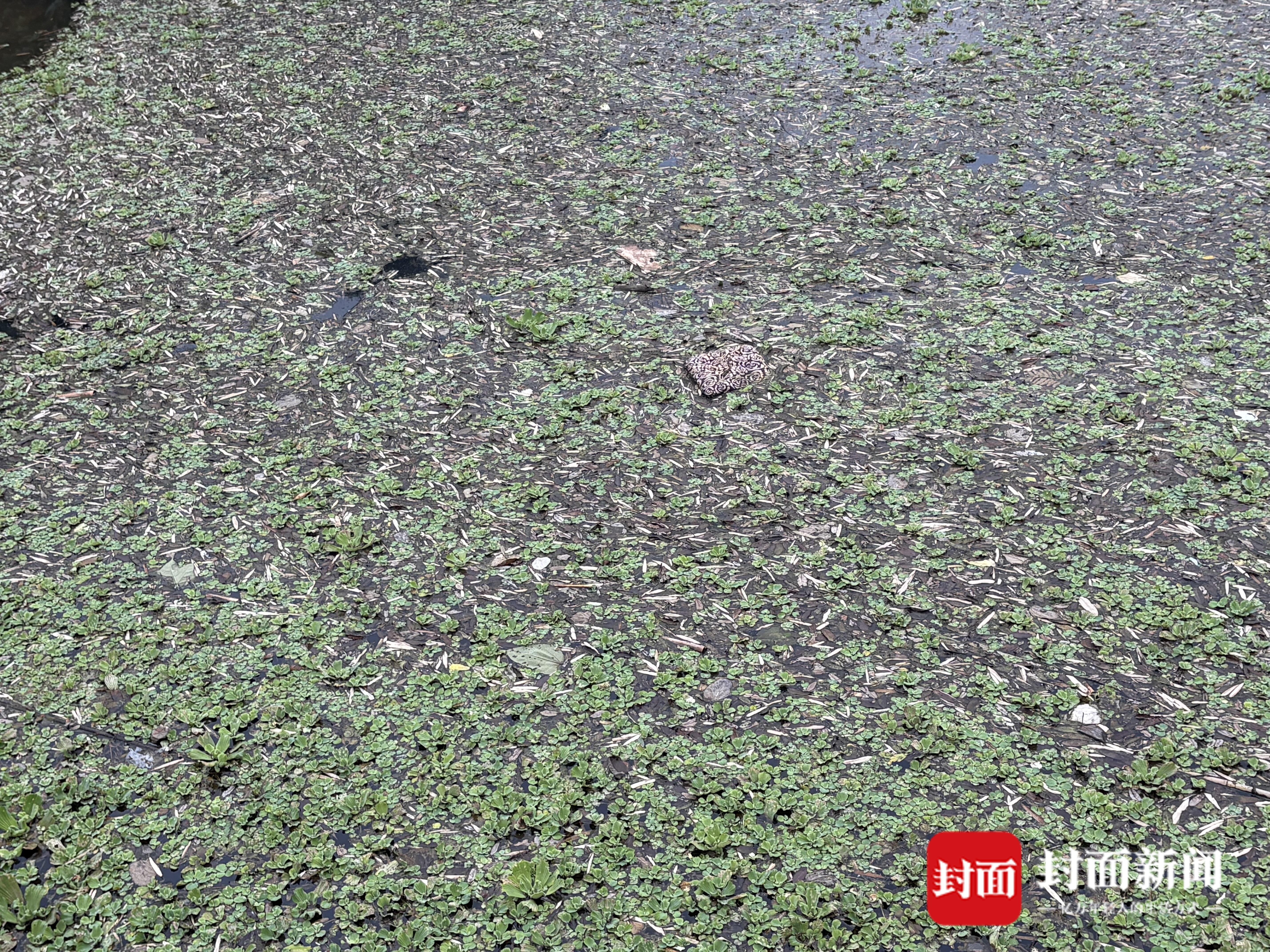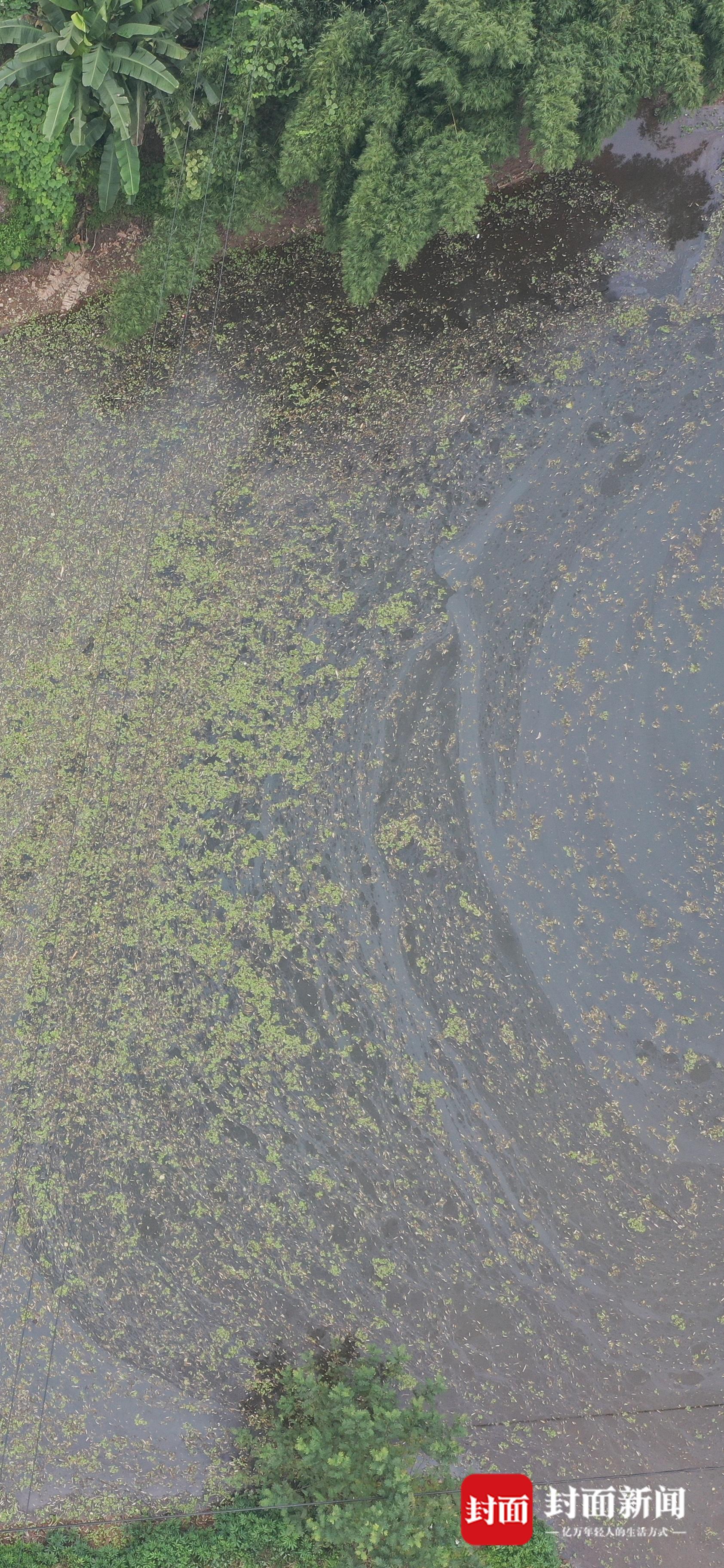 当天下午,记者走访发现漂浮物主要是外来入侵物种大薸,当地人称“水白菜”。其间夹杂着枯叶和生活垃圾,也有抱枕等生活用品,水色呈黄色。从空中俯瞰,能看到疑似油污的液体漂浮在水面上。